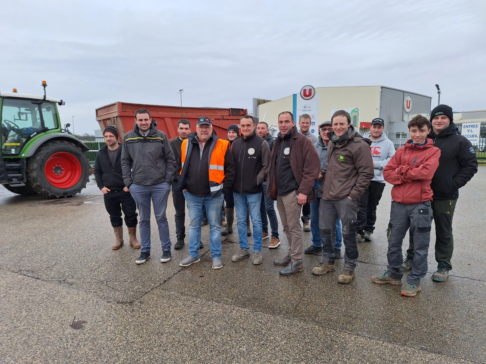 Dès mercredi après-midi, une soixantaine d’agriculteurs étaient présents sur la plateforme logistique de Super U à Saint-Just pour monter le chapiteau et bloquer les entrées et sorties de camions de livraison. A 17 heures, une première rencontre avait lieu avec les responsables de la plateforme et trois responsables de magasins Système U. « On demande clairement un engagement fort du groupe au niveau national sur la pleine application des EGA* et sur le fait que 100 % des coûts de productions soient appliqués dans la loi EGAlim 4. On souhaite que Système U soient à nos côtés et poussent auprès du ministre et des parlementaires », explique Justin Chatard, président des Jeunes Agriculteurs de l’Ain.