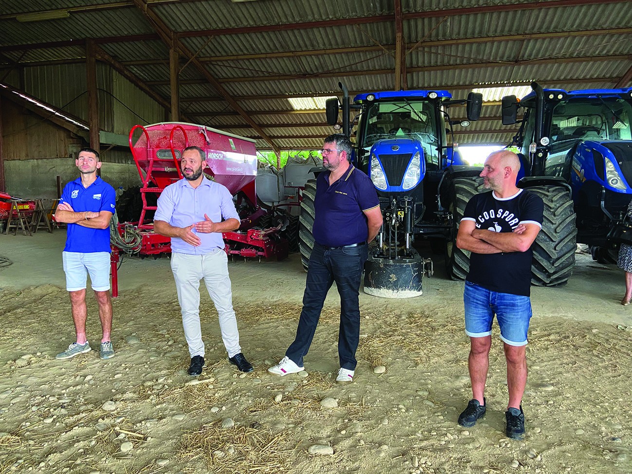 De gauche à droite : Guillaume Joux, secrétaire général des JA 01, Jonathan Janichon, secrétaire général de la FDSEA, Adrien Bourlez, président du syndicat et Romain Michon, céréalier, hôte de la journée. Tous ont pu échanger avec les agriculteurs présents. Photo/LD